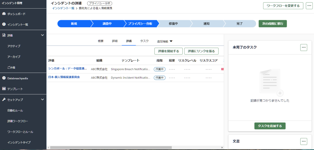 評価テンプレートは、汎用的なテンプレートからデータ侵害通知義務が法規制で定められているEU(GDPR)、シンガポールやアメリカの州ごとのテンプレートなどが用意されており、対象となる地域の法規制に対応した評価を実施することが可能です。