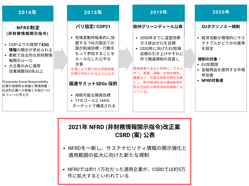 2015年にパリ協定合意以降には、企業に対してより野心的な気候変動対策が求められるようになります。これに伴い、企業のグリーン移行を促進すためESG投資環境が整備され始めます。以降、EUはサステナビリティ情報開示ルールの強化を加速することとなります。