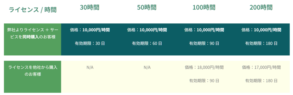 ※表に記載の「有効期限(日数)」はプロジェクト開始日を起点とし、ご購入いただいたサービス時間が有効期限切れとなるまでの日数です。各プランで定められた期間内で消化いただく必要があります。