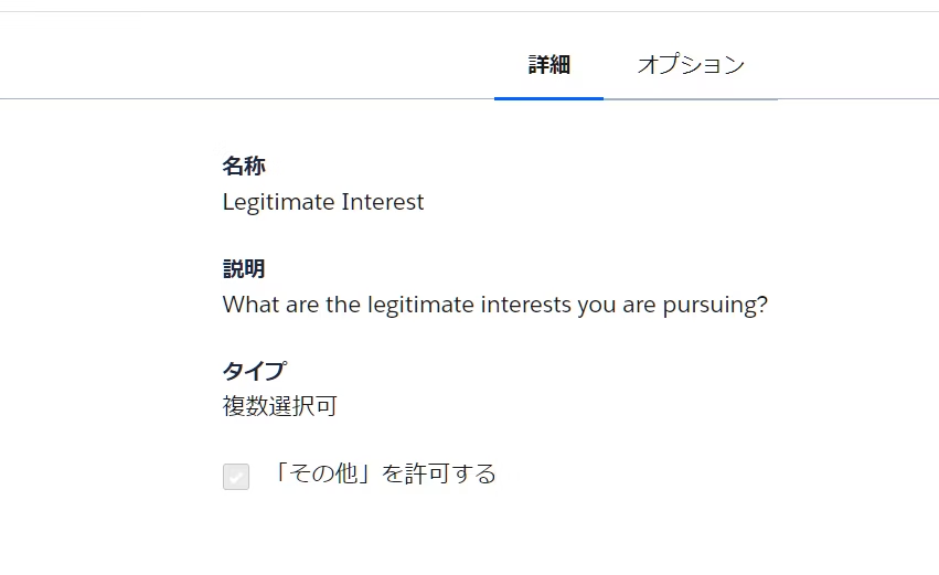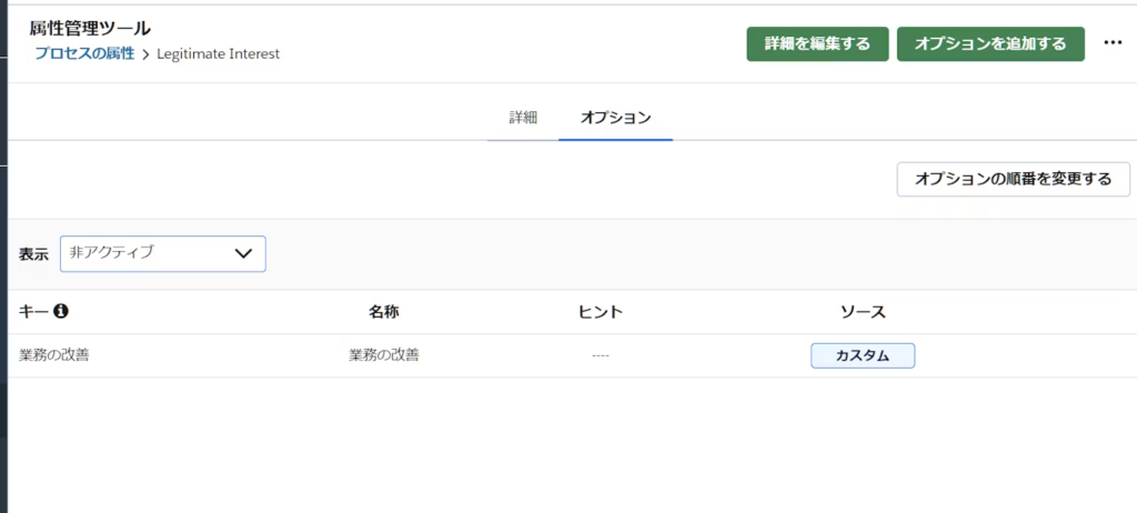 実際に「その他」でカスタム値を入力した場合、その属性で入力値が選択肢として追加されているかを確認したところ、アクティブな選択肢ではなく、「非アクティブ」な選択肢として追加されているのが確認できます。