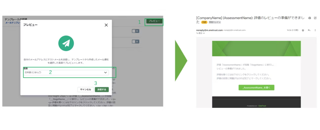 動的な変数を有効に使うことで、回答者や承認者がメールを受け取った際に、何をすればよいのか(どのアセスメント(評価)に対して、質問を回答したり、レビュー、承認すればよいのか)を正しく理解し、アクションに移すことが可能です。