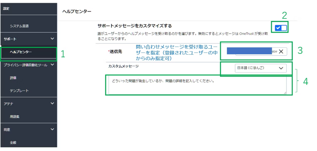 組織によっては、ユーザーが直接OneTrustのサポートに問い合わせを挙げるのが好ましくない、いったん社内の担当部署で受け、精査したうえで対応したいというニーズもあるかと思いますが、こうしたニーズに対応するために、OneTrustではグローバル設定で「?」ボタンをクリックした場合の挙動を変更することが可能です。