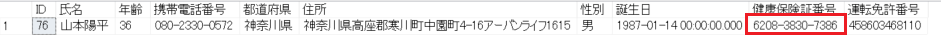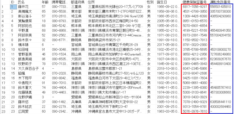 ダミーデータには、意図的に、下図赤枠の健康保険証番号カラムに12桁の数字(実はマイナンバーの番号が入っています。)と、青枠の運転免許証番号カラムにもマイナンバーと誤認しやすい12桁の数字を入れています。