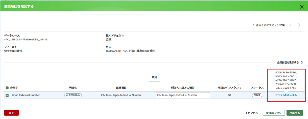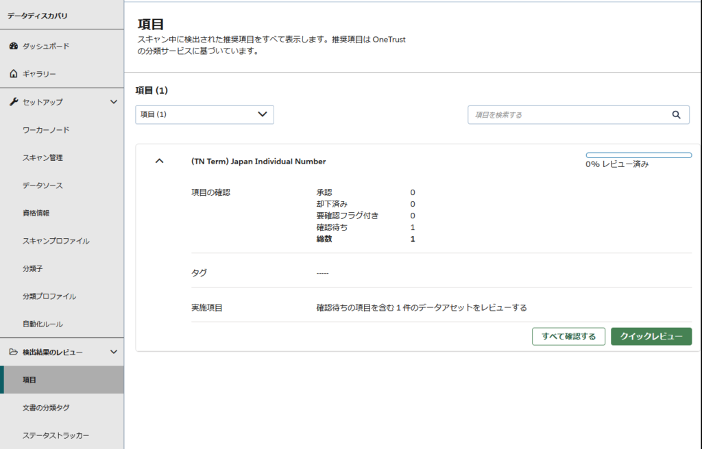 OneTrustが対象データソースをスキャンし、「これはマイナンバーかもしれない」用語(分類ラベル)を自動的に提案します。