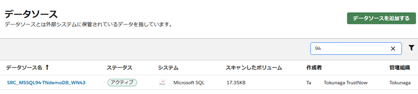 「データソース」とは、MS SQL Server、Amazon S3、Salesforce等のデータベース、ファイルサーバー、クラウドストレージ、SaaS等のスキャン対象に対する情報をまとめたもので、資格情報(※1)やスキャン頻度などのスキャンに必要な情報が含まれます。また、対象データソースに対する過去のスキャン結果やスキャンの結果判明したデータベースのテーブル等の構造やスキーマ、ファイルフォルダのフォルダ構成やファイル情報、関連するアセット(詳細は後述)等もここで見ることができます。
