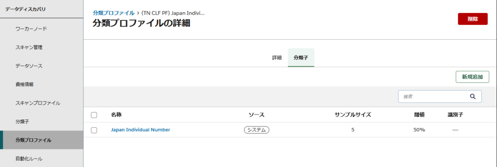 今回の検証では、あらかじめ用意されている「Japan Individual Number(マイナンバー)」の分類子を分類プロファイルに設定しました。