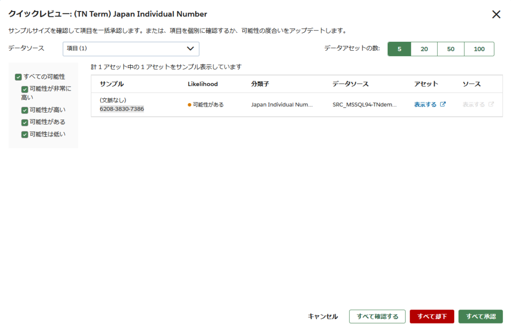 誤検出を防ぐため、まずは検出されたデータをレビューして、正しく検出が行われているか?(この情報が本当にマイナンバーであるか?)を確認します。