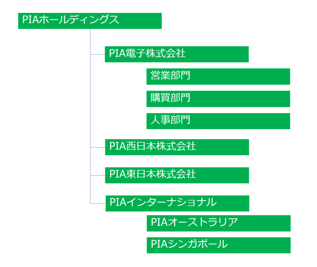 上記の組織階層の例では、「PIA電子株式会社」の営業部門のユーザーは、配下にある「営業部門」の組織を割り当てた場合、営業部門のアイテムを見ることができますが、同じくPIA電子株式会社の配下にある組織「購買部門」や「人事部門」のアイテムは見ることができません。