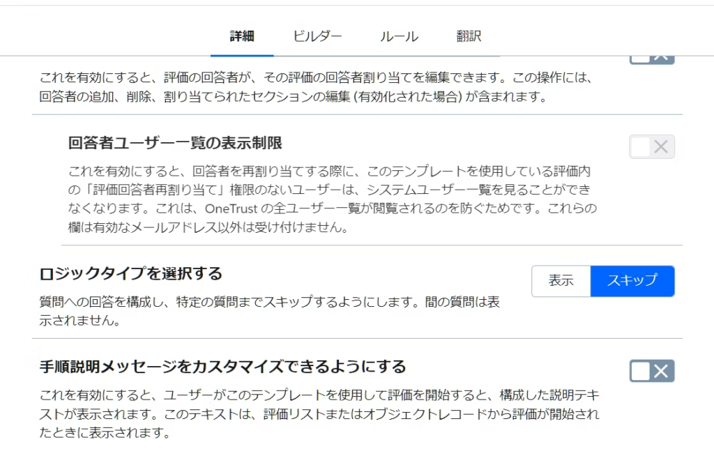 表示・非表示を制御したい対象の質問に対して設定します。それ以前の質問の回答を条件に判定し、質問の表示、非表示を制御します。OneTrustのヘルプによるとスキップロジックよりも汎用性が高いとされており、よりきめ細かい設定が可能です。