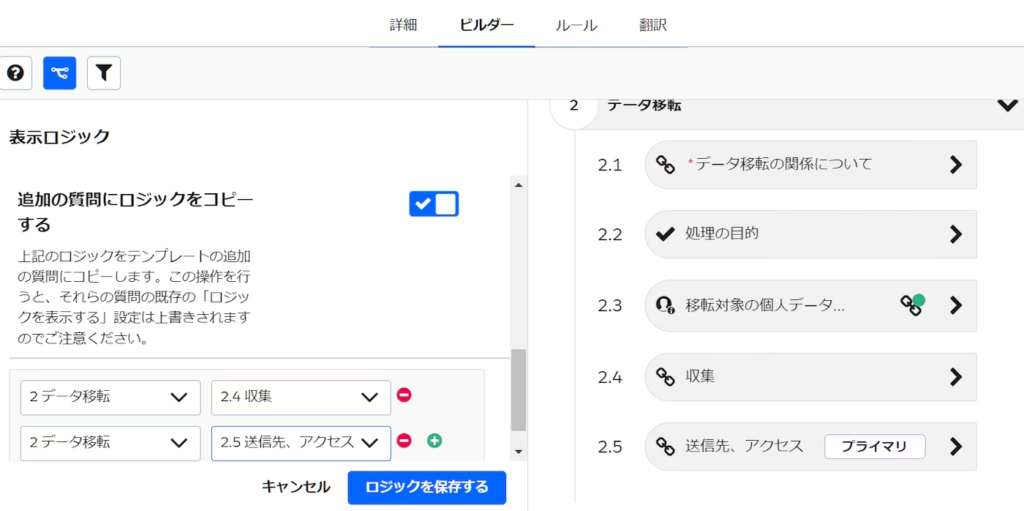 表示ロジックでは、1つ1つの質問に表示条件を設定することもできますが、もし同じ条件が複数続く場合、「追加の質問にロジックをコピーする」機能を使用することで一括で設定することも可能です。