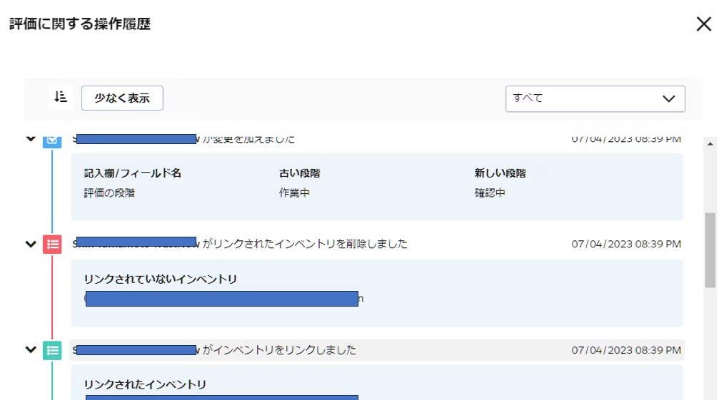 承認者は、アセスメント(評価)内で操作履歴のトラッキング機能を使用して更新内容を参照することができます。