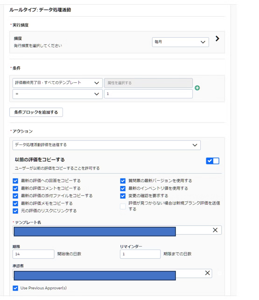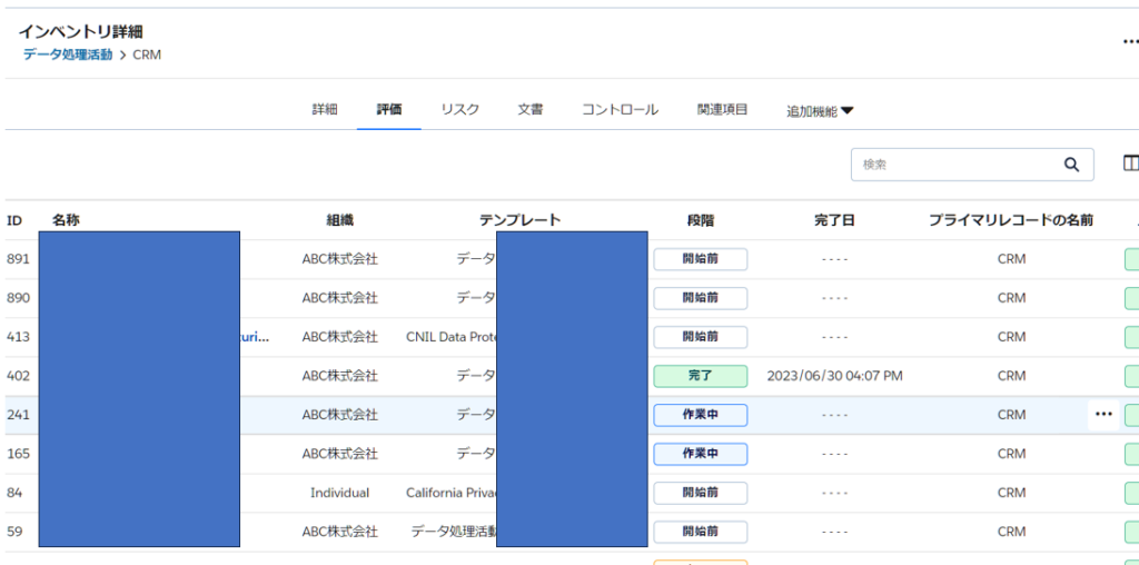 プライマリレコードを使用することで、アセスメント(評価)にデータマッピングのレコード情報を引き継がれ、データマッピングのインベントリ(台帳)の入力済み情報について、アセスメントの質問を一から回答する手間が省けます。また、アセスメントの結果、(アセスメントが承認された段階で)入力された最新の値は、データマッピングのインベントリ(台帳)に反映することが可能です。