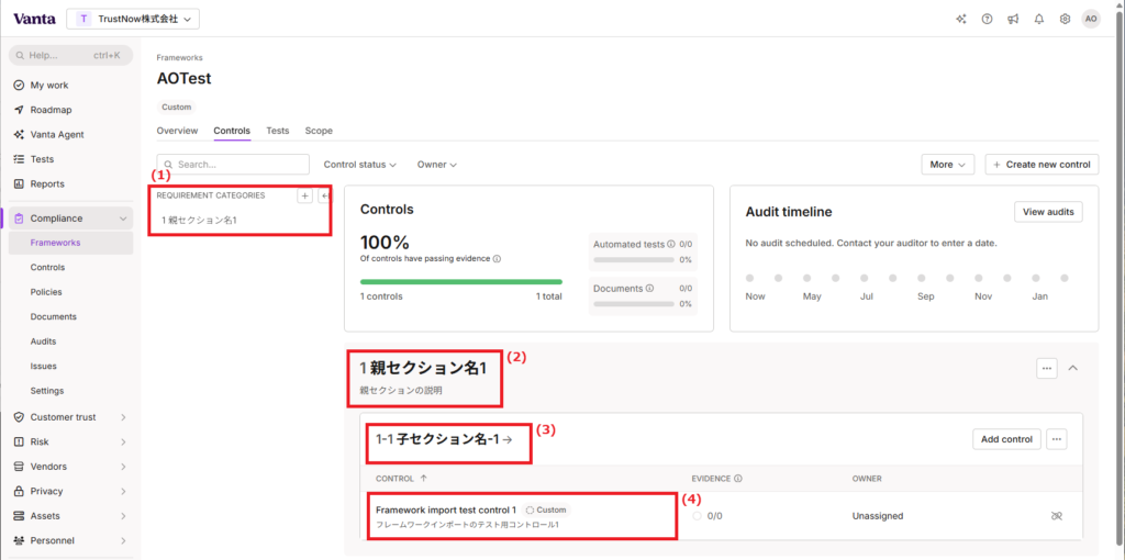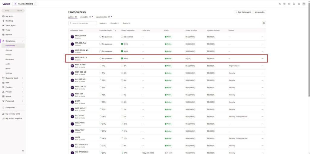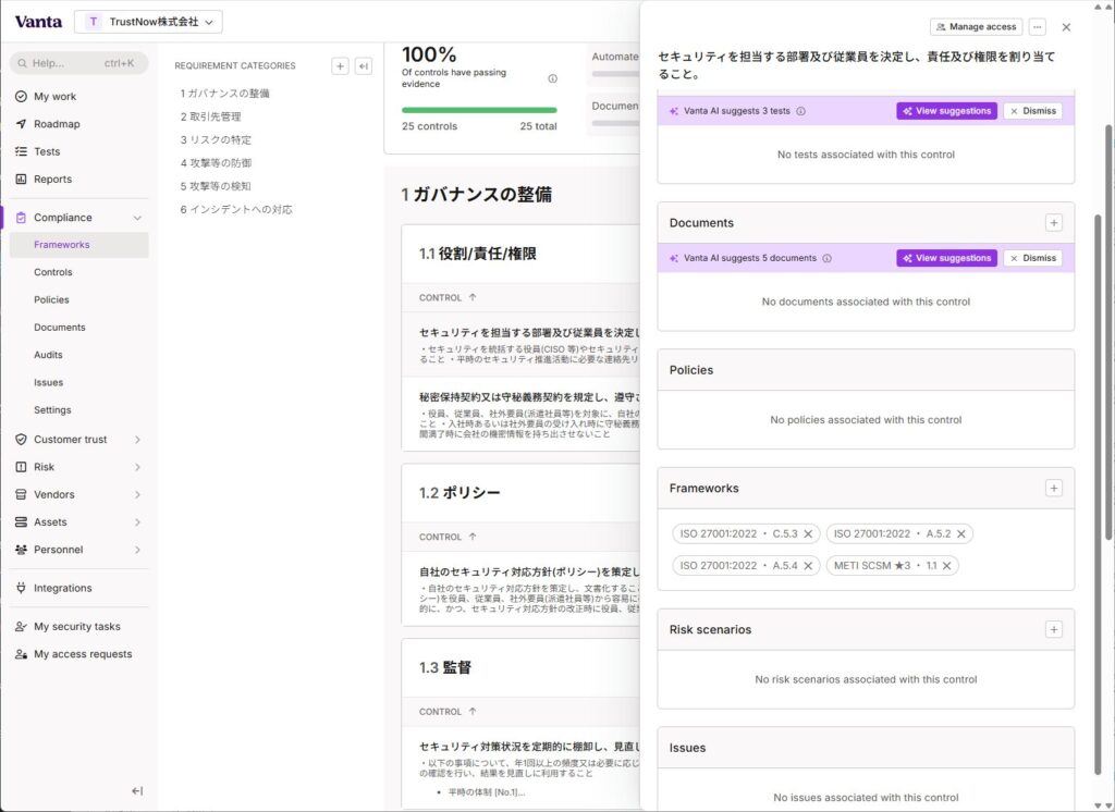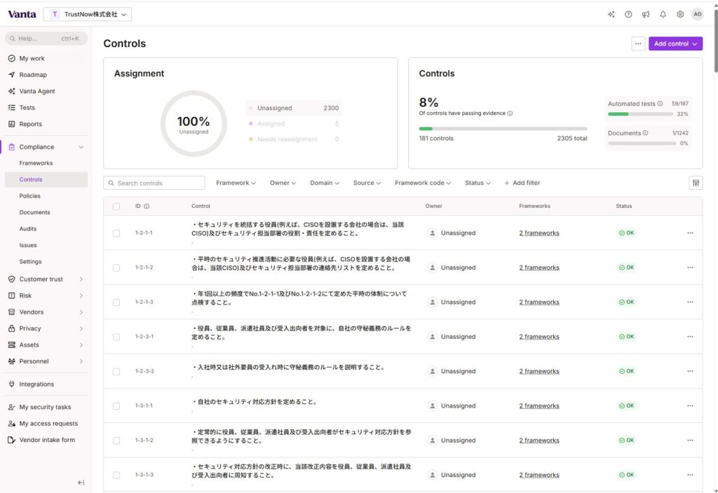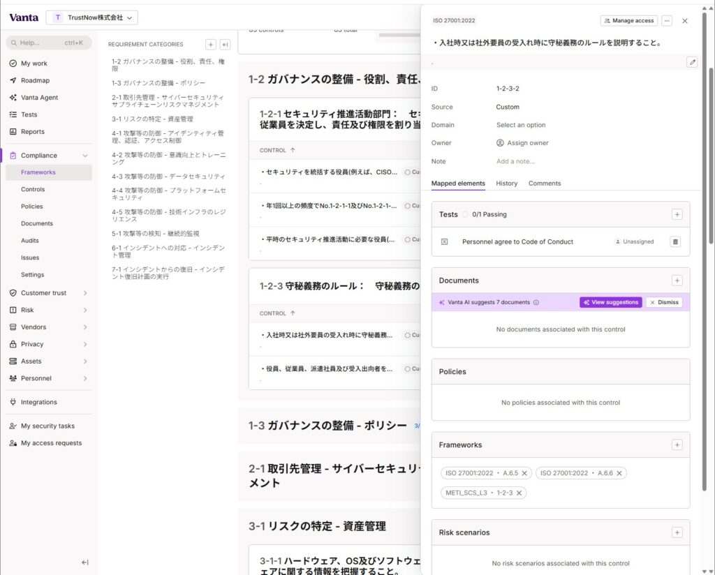 経済産業省評価制度の要求事項が、コントロールとしてVantaにインポートされ、すぐに監視可能な項目として登録されます。