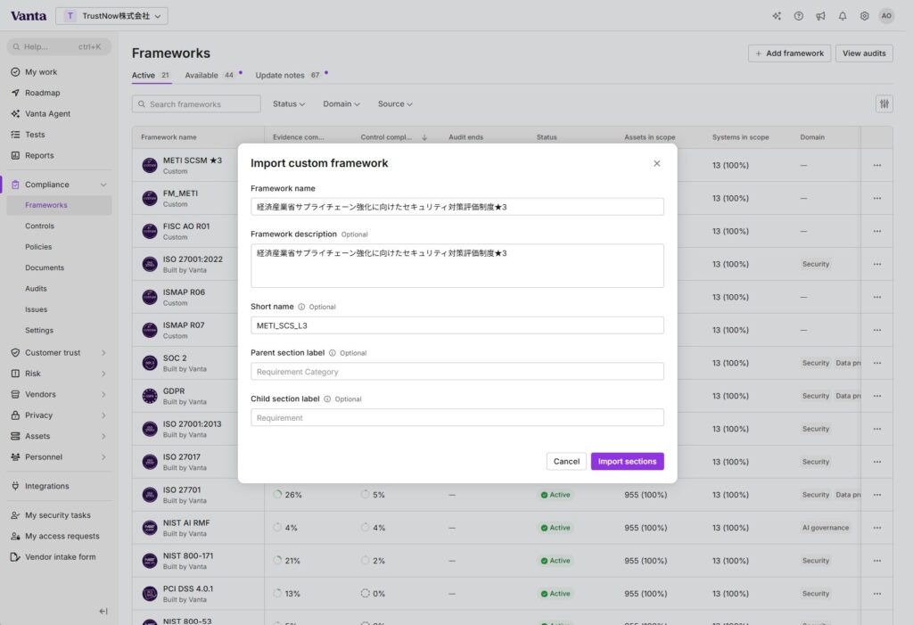 手順1. 経済産業省 サプライチェーン対策評価制度 要求事項の Vanta 形式への変換