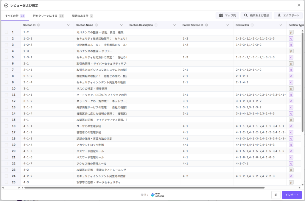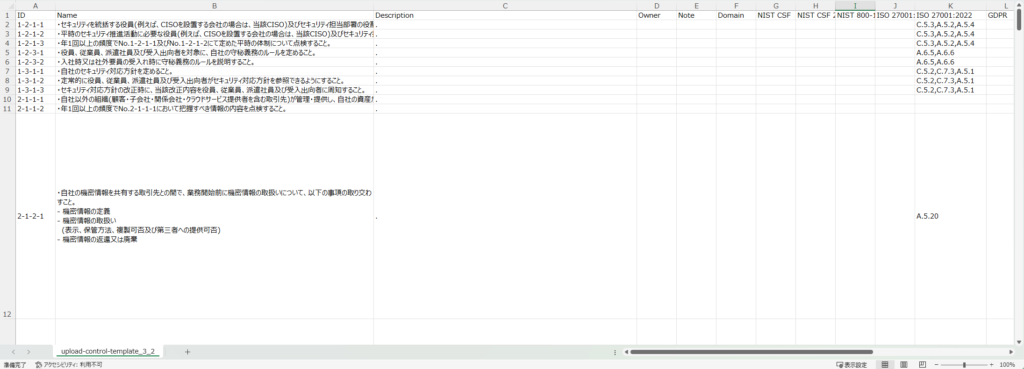 今回はテンプレートのName列にSCS評価制度の評価基準をいれます。Description列は解説や評価方法を入れたいのですが20025年12月25日リリースの資料では「具体的な評価手法やガイダンス情報を提示するためのガイダンス資料を今後策定」とあるため今回は入力なしとします。ただし、Vantaの仕組み上、一括インポートをする際に設定をする必要があるため「.」をインポートするコントロールには設定しインポートします。この時、参考文献として書かれているISO27001:2022の管理策をしていいすることでISO27001:2022の管理策と紐づけができます。他のフレームワークのコントロールとの紐づけはコントロールとしてインポートした後に手動でリンクすることも可能です。(注意点: 要求事項の場合は、章番号の前に「C.」をつける必要があります)