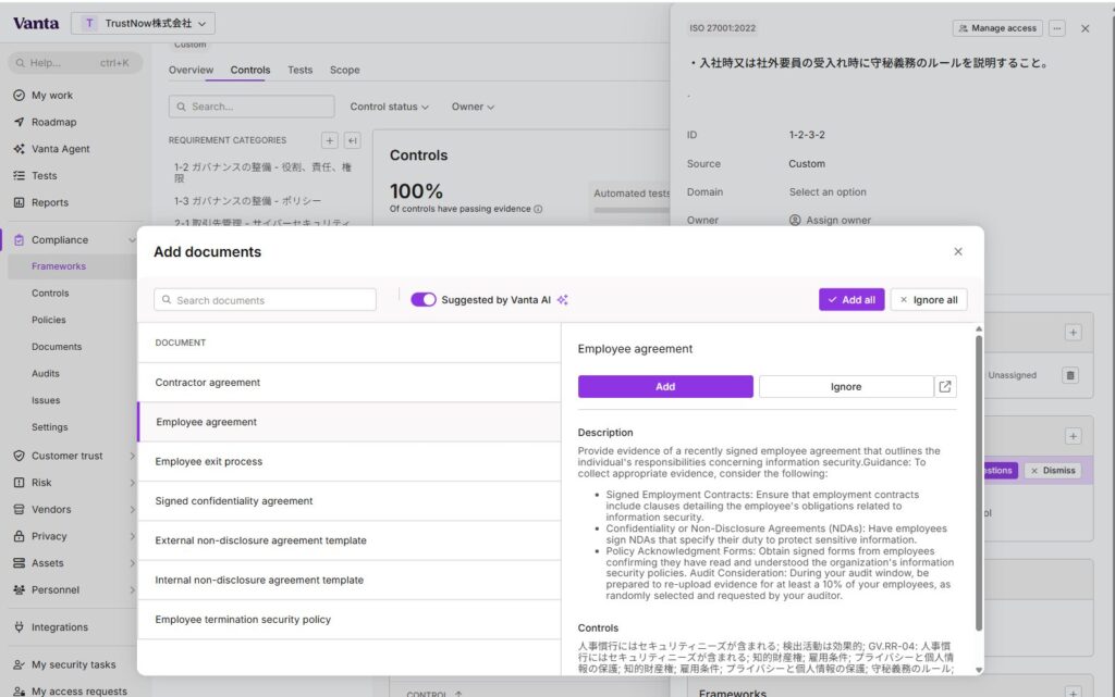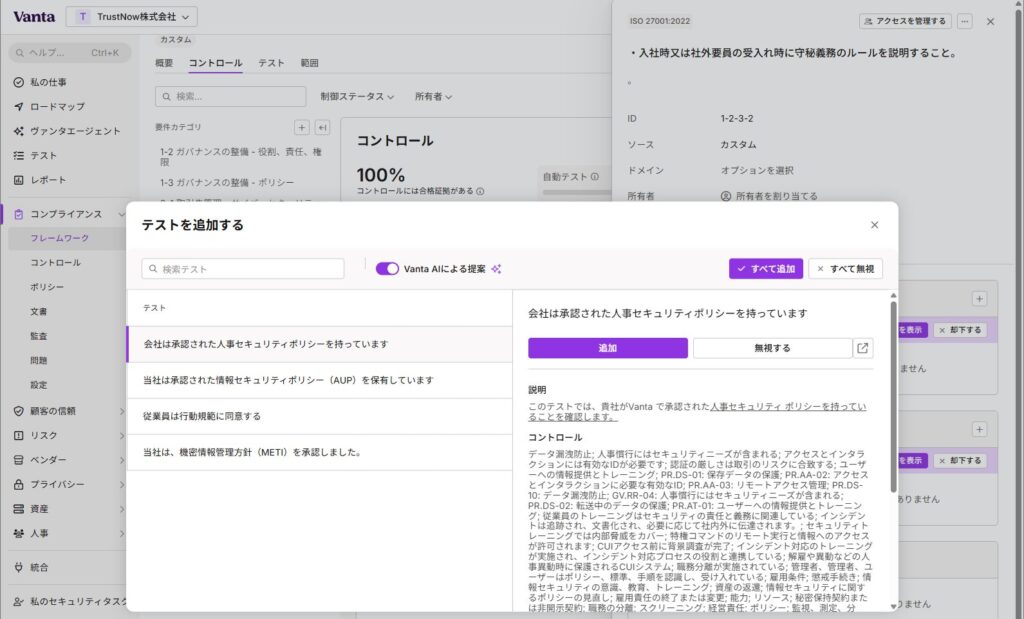 ISO 27001:2022 をマッピングした後、ユーザーはVantaが標準で持つ ISO 27001:2022 の既存のテスト(テストケース)を選択して紐づけます。この際、Vanta AIによる提案機能を活用することで、Vantaがあらかじめ持っているテスト(テストケース)を適切かつ効率的に適用できます。もちろん、不足する項目に対してはカスタムテストも設定できます。
