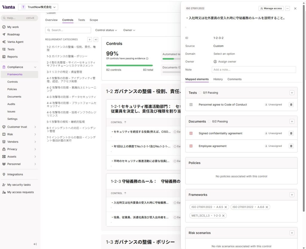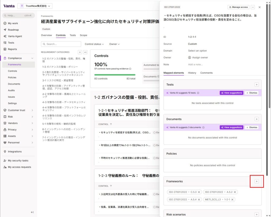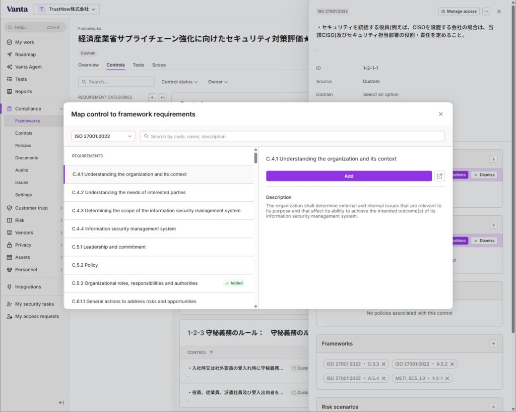 次に、出来上がったSCS評価制度のカスタムフレームワークのコントロールを、Vantaが持つISO 27001:2022 のフレームワークと自動テスト、ドキュメントに結びつけます。