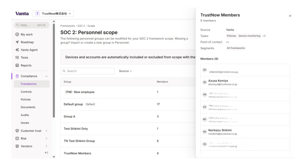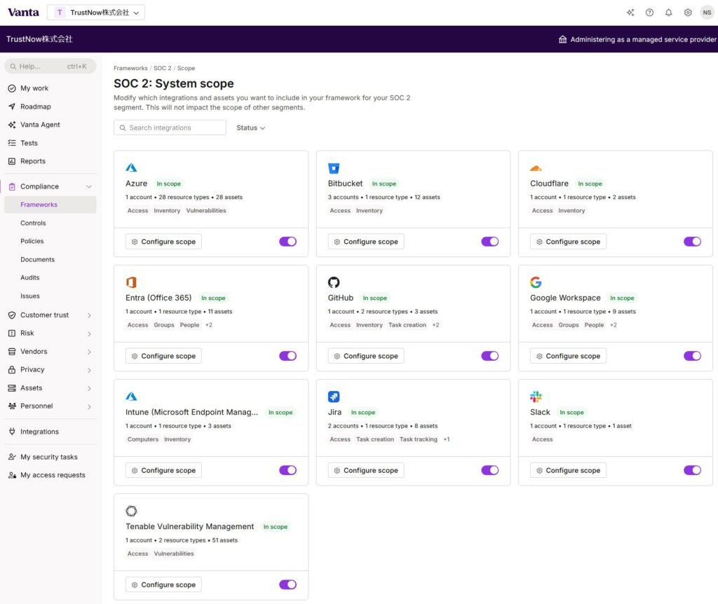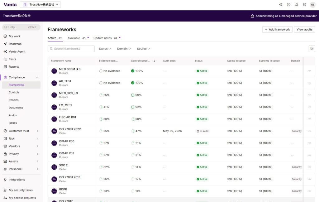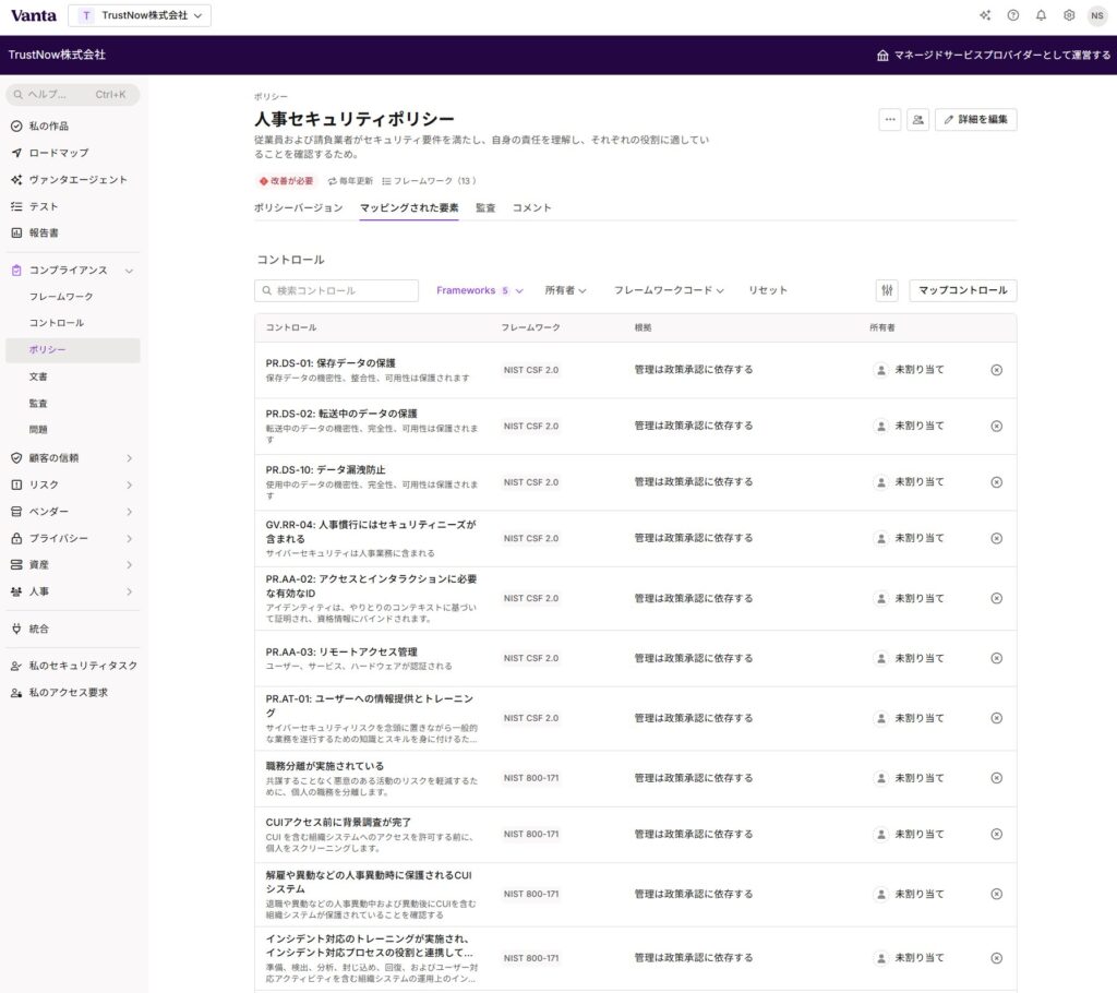 利用可能なフレームワークですが、ISO 27001、SOC2、NIS 2、HIPPA、NIST 800 など数多くのものがVanta に事前登録されており、そのうち、お客様がご契約しているフレームワークが、利用可能なフレームワークとして一覧に表示されます。
