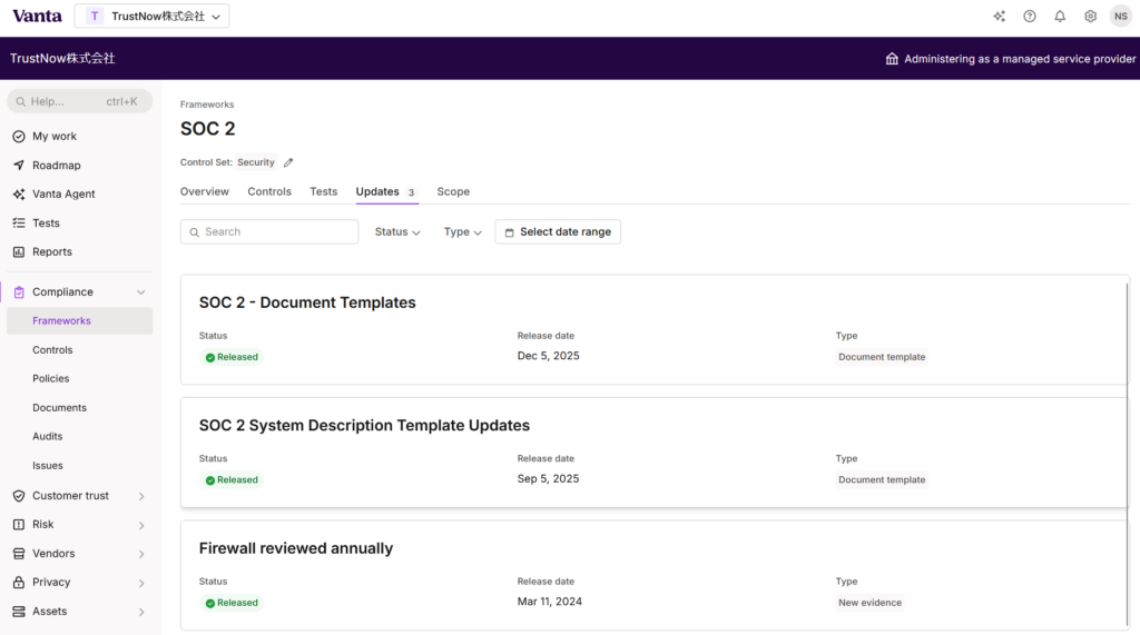 ここでは、SOC 2 に関連する機能追加やポリシーテンプレートの雛型の更新等の更新情報を確認することができます。