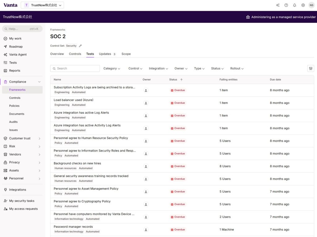 ここで、SOC 2 に関連するこコントロール(管理策)とその対応状況を見ることができます。