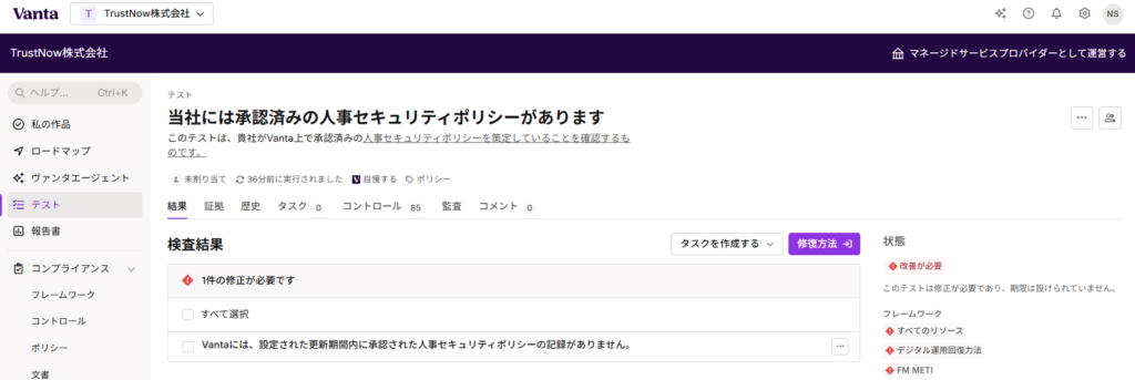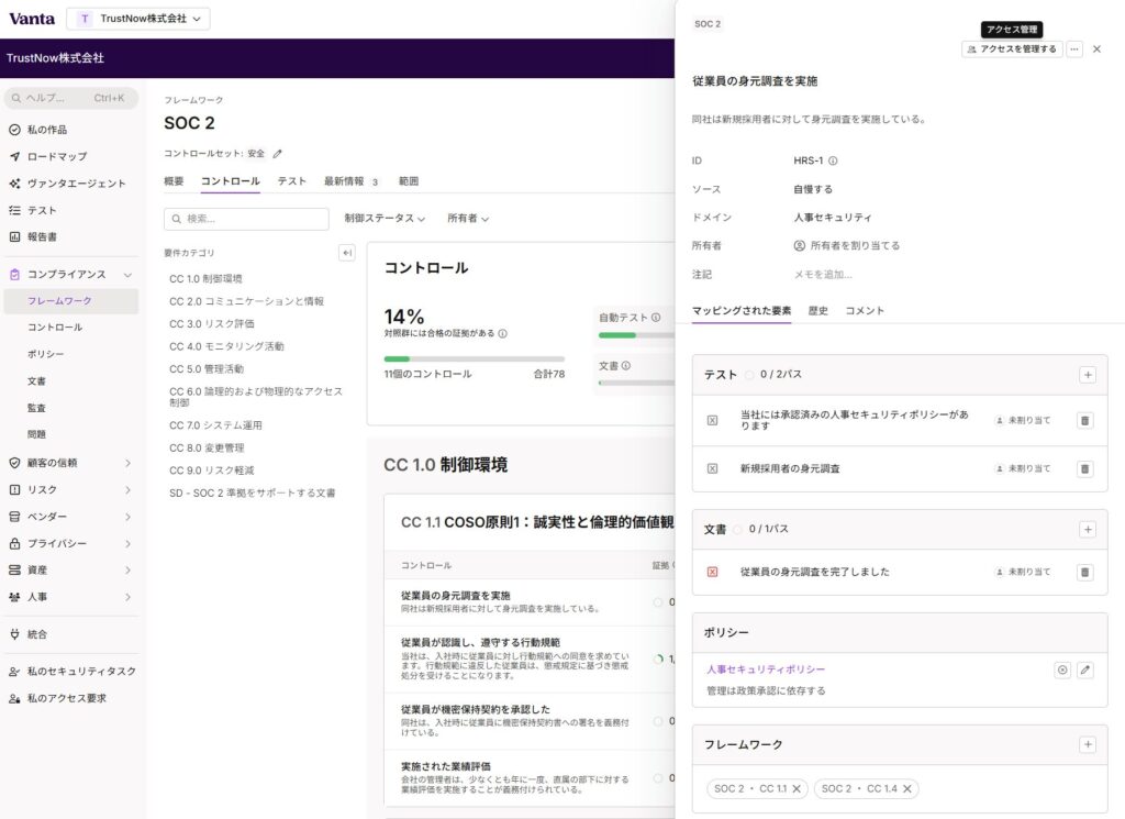 • Vanta上で定義される各種の承認済みポリシー(規定)の有無