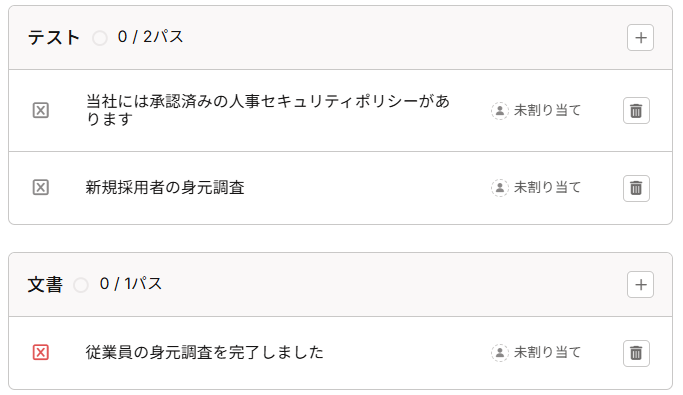 「テスト」は、Vantaによって事前定義されたもので、下記のような項目で構成され、Vantaによって自動的に判定される合格基準といえます。