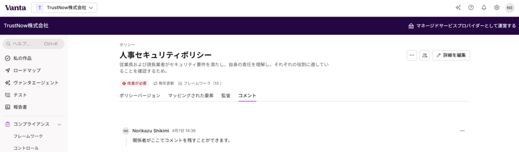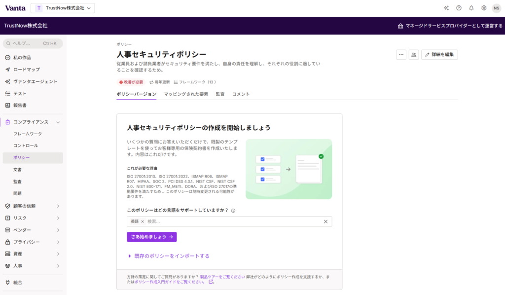 ちなみに、Vanta はポリシーテンプレートなどは日本語化されているものの、メニューやメッセージなどは、まだ日本語化されていません。
